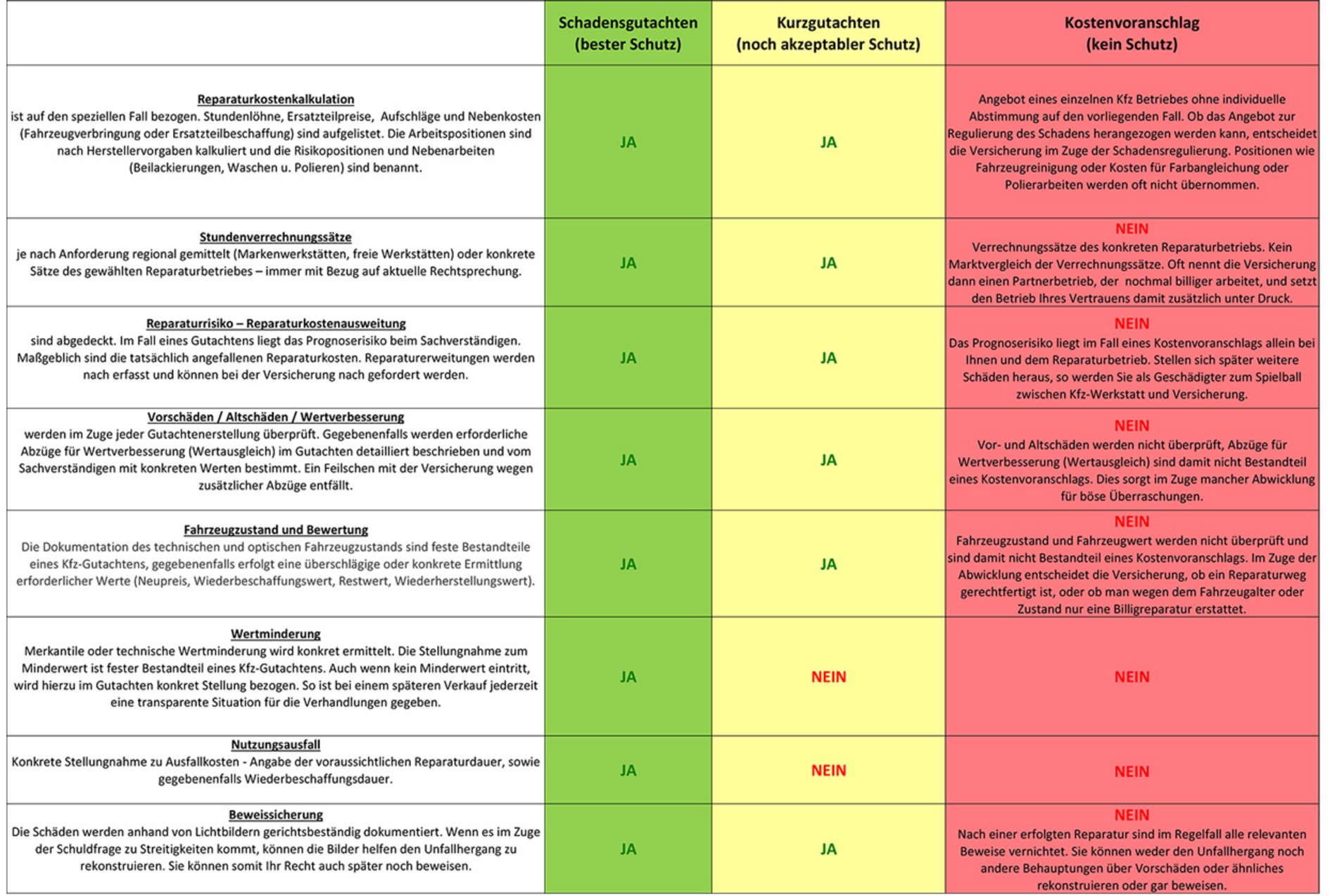 Im Folgenden Vergleich zwischen Kfz-Gutachten, Kurzgutachten und Kostenvoranschlag finden Sie die wichtigsten Punkte direkt gegenübergestellt: